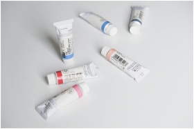 Close-up of colorful paint tubes arranged on a whi