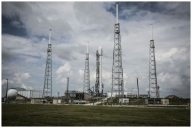 Industrial rocket launch pad with tall towers unde