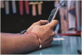 Detailed view of a hand with a tattoo holding a sm