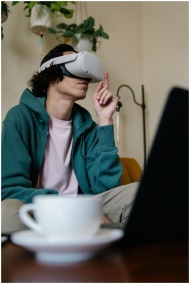 A young man using a VR headset at home, fully imme