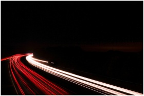 Captivating long exposure of car lights on a curving road at night, showcasing motion and vibrant colors.