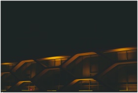A modern building facade illuminated by neon lights, showcasing futuristic architectural design at night.