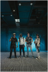 A diverse group of adults enjoying an immersive VR gaming experience indoors.