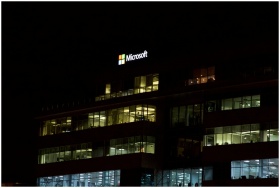Nighttime view of a brightly lit modern office building, showcasing urban architecture.