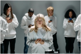 Diverse group of individuals engaging with smartph