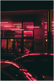 A lively urban street scene with neon lights and bustling nightlife at a restaurant.