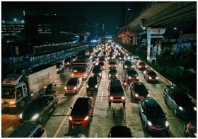 A bustling urban highway filled with cars and buses at night, showcasing city life and transportation.