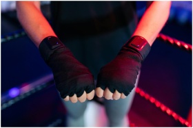 Female boxer wearing smart gloves in a gym, showcasing fitness and technology integration.