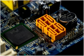 Detailed view of a computer motherboard showcasing