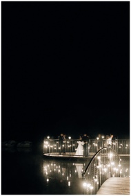 A romantic nighttime wedding with couples on a beautifully illuminated bridge reflecting in water.