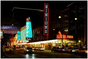 Neon lights illuminate Fremont Street, showcasing Binion's Hotel in Las Vegas at night.