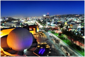 An impressive night view of Tijuana cityscape featuring vibrant lights, architecture, and monument.