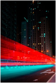 Vibrant night view of Dubai's skyscrapers with dynamic red and blue light trails.