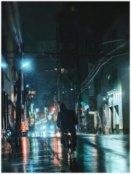 A man cycling through the rainy, illuminated streets of Tokyo at night, reflecting urban life.