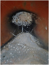 Close-up of rust and mold textures forming unique patterns on metal, creating an abstract art piece.
