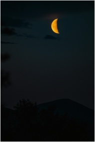 A serene crescent moon in a deep night sky above the Norwegian mountain range, creating a striking nighttime landscape.