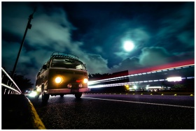 A vintage VW van on a night highway with dramatic light trails and a full moon backdrop.