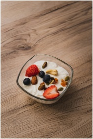 A bowl of yogurt topped with fresh strawberries, blueberries, and assorted nuts on a wooden table.