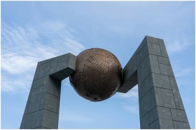 A unique modern sculpture with a large metal sphere supported by two stone pillars set against a clear blue sky.