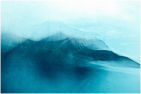 Dreamy abstract image with blue hues blending sea and mountains, evoking tranquility.