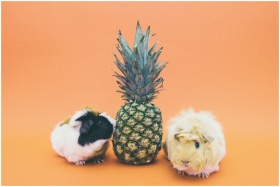 Two cute guinea pigs with a pineapple on a vibrant orange background, highlighting a playful and colorful theme.