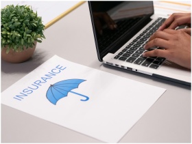 Close-up of hands typing on laptop with an insuran