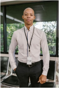 A confident businessman in a white shirt stands indoors at a conference.