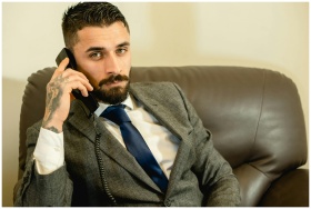 Bearded man in corporate attire sitting indoors on a call.