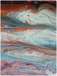 Dynamic abstract painting of swirling colors in blue, orange, and white, displaying fluid patterns and rich texture.