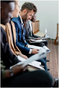 Business professionals in a corporate meeting revi