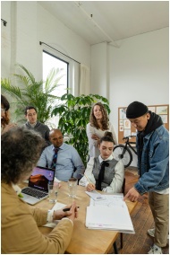 A diverse group of coworkers engaged in a productive office meeting around a table with documents and a laptop.