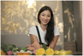 Positive ethnic female florist wearing apron smiling and looking at camera while standing near counter with fresh roses and silk tapes for composing bouquet inside flower store
