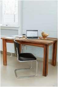 Simple office desk setup with a laptop, coffee cup, and wooden bird figurine.