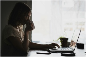 A businesswoman works remotely from home, sipping coffee and using her laptop.