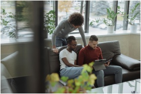 Three men discuss projects using a tablet in a bright office lounge, promoting teamwork.