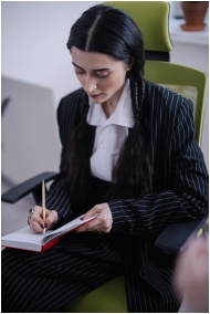 A professional woman in a blazer writes notes in a