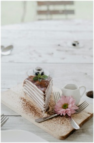From above composition of sweet pancake cake with whipped cream placed on light wooden board with cutleries and delicate pink flower