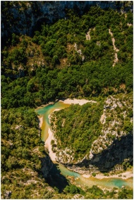 Stunning aerial shot of Verdon Gorge in Provence, France with lush greenery and clear water.