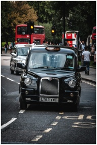 Classic black taxi navigating a bustling London street with red double-decker buses