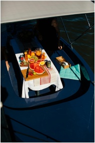 From above of bunch of different cut fruits and drinks on table prepared for party on boat