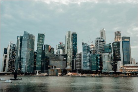Dramatic view of Singapore's modern skyline from Marina Bay at sunset, reflecting on the water.