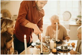 A warm family gathering around a festive Thanksgiv