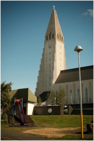 View of Hallgrimskirkja church and playground in R