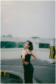 A woman posing in an urban landscape as the sun sets in Cimahi, Indonesia.