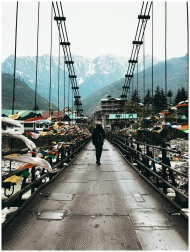 A lone traveler crosses a colorful bridge in Himachal Pradesh with snow-capped Himalayan peaks in the background.