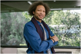 Smiling business professional posing confidently in a modern office with greenery outside.