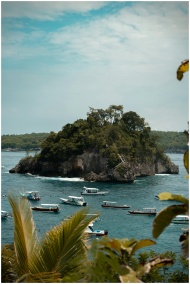 Scenic view of a lush tropical island surrounded by boats and clear blue waters.