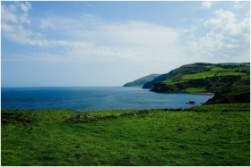 Breathtaking view of rolling green hills meeting the ocean under a clear blue sky.