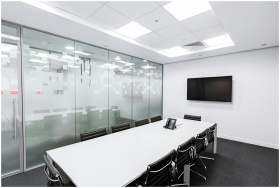 Sleek, minimalist conference room with glass walls, long table, and office chairs.