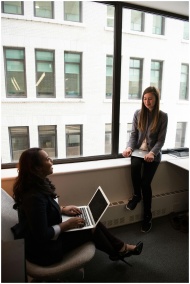 Two businesswomen discuss work in a contemporary office setting with laptops.